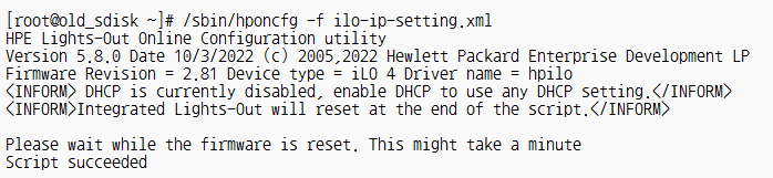 # /sbin/hponcfg -f ilo-ip-setting.xml